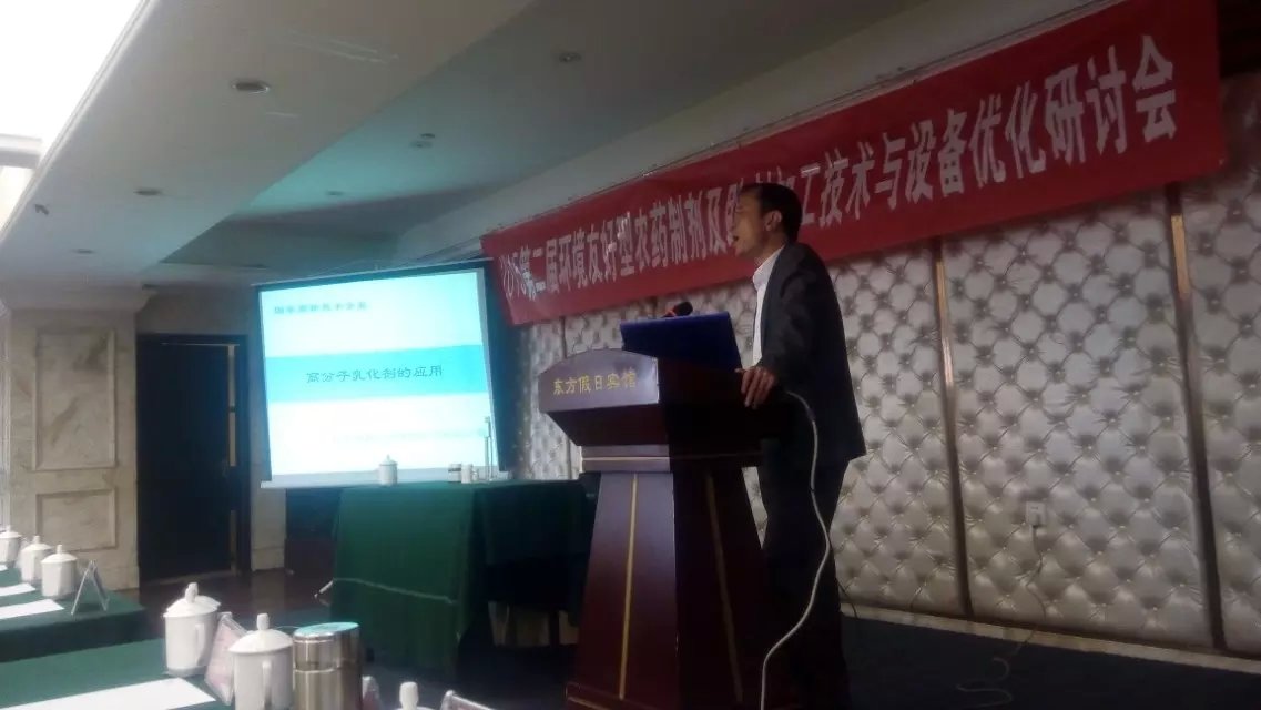 2015年4月11日,张磊董事长、康燕琼、黄桂珍应邀参加由中国农业国际合作促进会主办的“2015第二届环境友好型农药制剂及助剂加工技术与设备优化研讨会”。在《高 分 子 水 乳 剂 专 题 研 讨 会》上,张磊董事长做了《高分子乳化剂的应用》专题报告,对我司现有的植保制剂相关科研技术及科研成果进行了阐述。